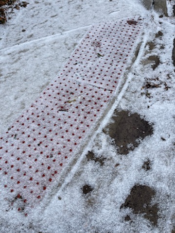 And finally, the most dangerous of them all – the tactile paving as the sidewalk ends and the street begins. Little bumps that are so slick in the snow and rain, I would rather just jump over them than to endure the fate that awaits.