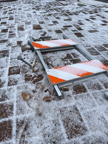 2. A traffic barricade – flat on the sidewalk – random pieces sticking up next to it.