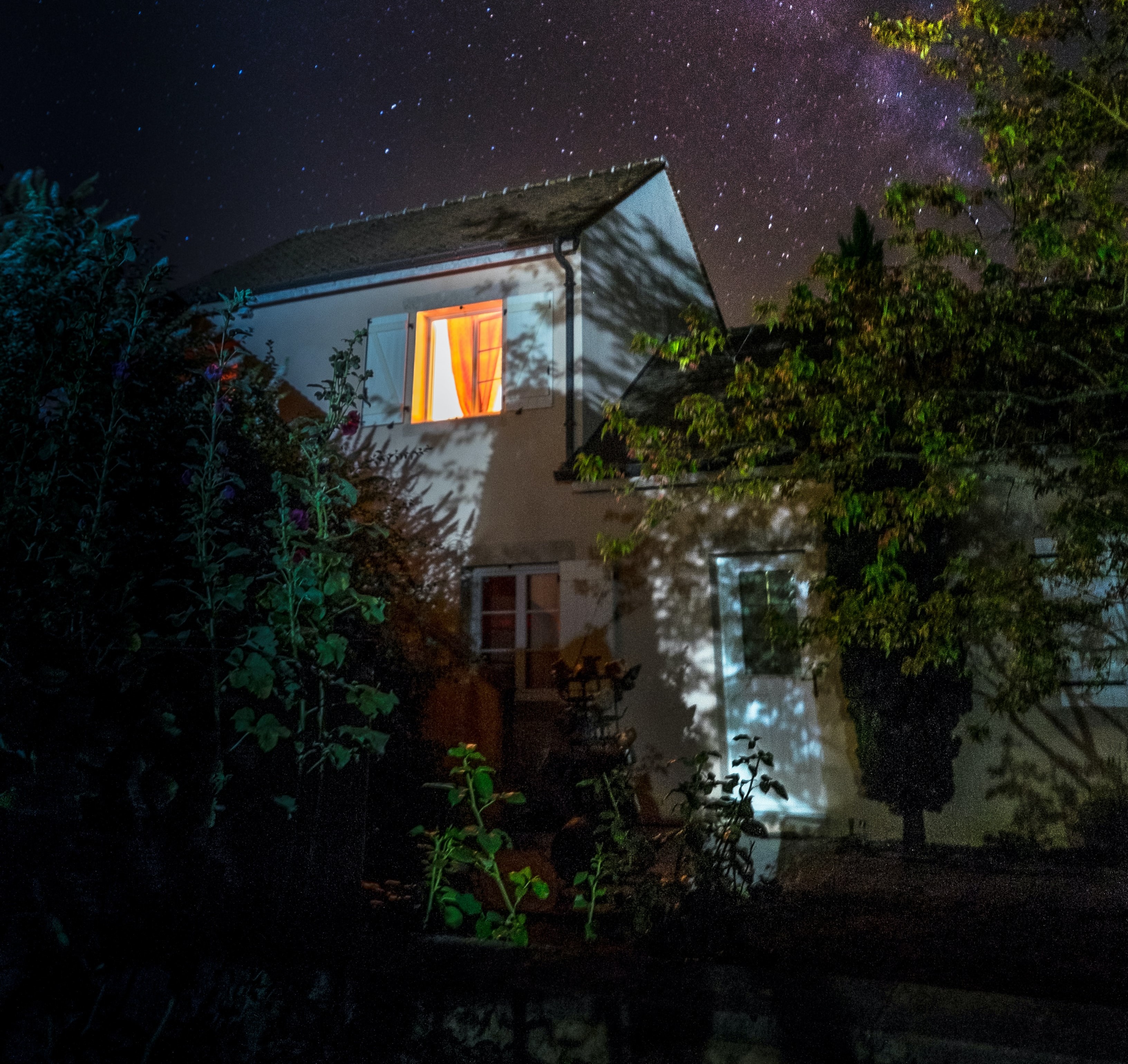 I look up at our bedroom window from the backyard. The lights that once glowed brightly switch off.